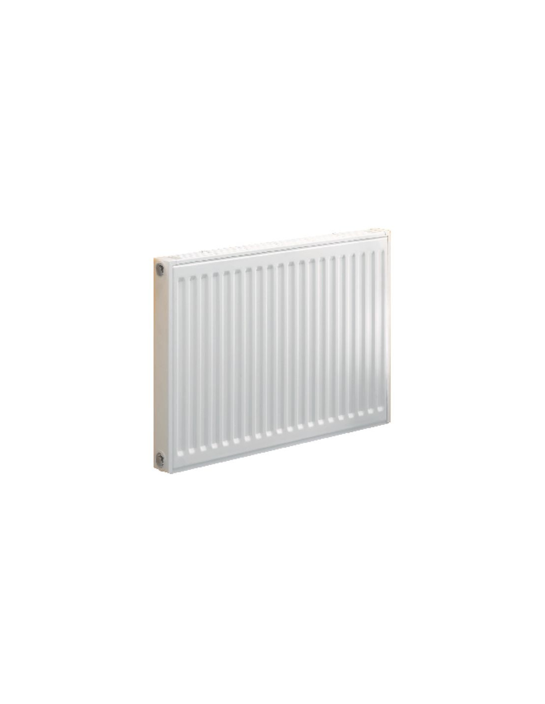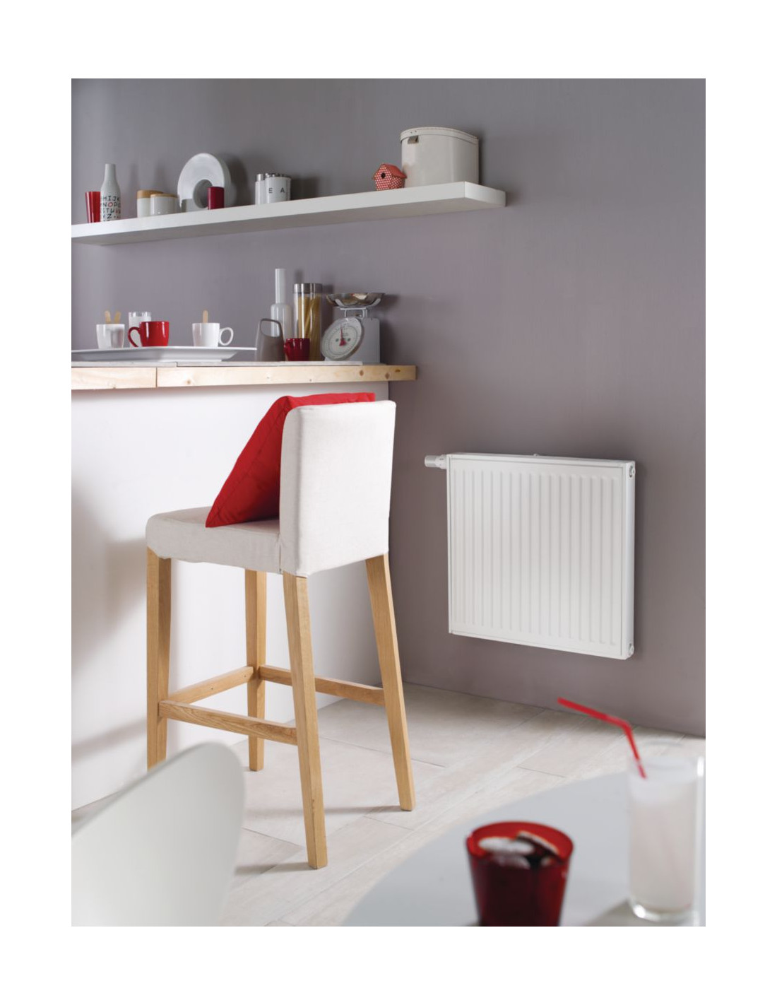 Radiateur acier revêtu d'une peinture époxy polyester, couleur blanc RAL 9016. . Joues latérales avec clips de maintien, montées d'usine . Grille supérieure . 4 orifices Ø 1/2" . 1 bouchon Ø 1/2" (avec purgeur orientable et joint) . 1 bouchon Ø 1/2" (avec joint) . Pression de service maximum 10 bar. . Assemblage de deux panneaux avec ailettes . Epaisseur 101 mm . Chaleur diffusée par convection et rayonnement